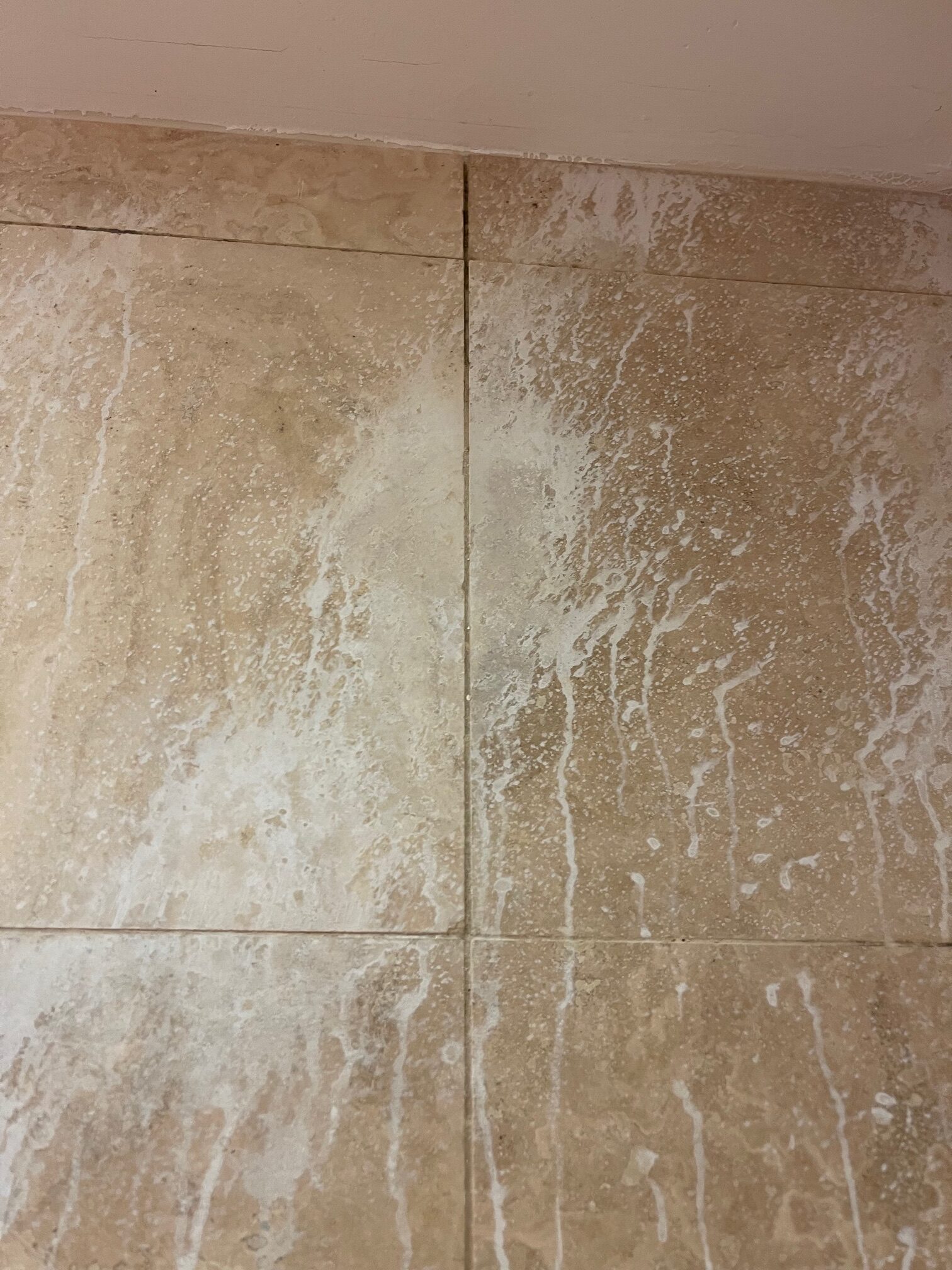 The project began with a detailed inspection to assess the damage and determine the best course of action. After thoroughly cleaning the travertine to remove soap scum and grime, we used diamond abrasives to hone and level the etched areas. This step eliminated the damage and restored a smooth, even surface.